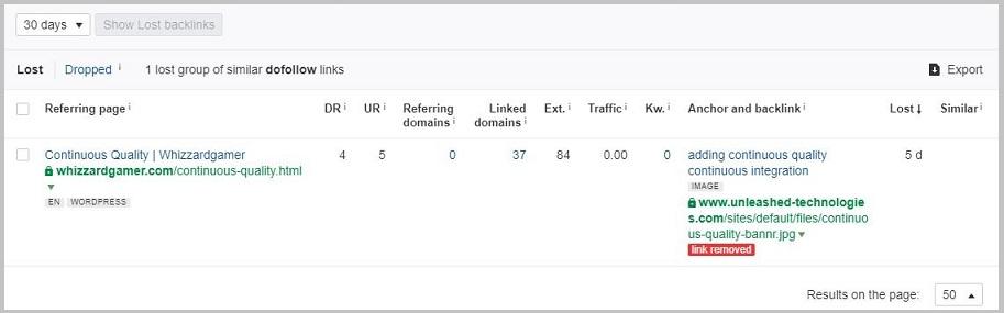 Unfortunately, backlinks are lost all the time. Losing links to high-value assets can lead to decreased search results for that page's targeted keywords. That is why you should be actively monitoring your overall backlink profile and backlinks pointing to high-value pages on your website. You can do this using an SEO tool like Ahrefs. From site Explorer, enter your domain. Next, choose “Lost” under the Backlink profile located on the left-hand menu. Choose the time frame you want to review. Here you will see any lost backlinks and the reason they have been lost. Then work to reclaim them. (Note: filter your results to show only dofollow links. Focus on them only, as these are the links that pass authority)